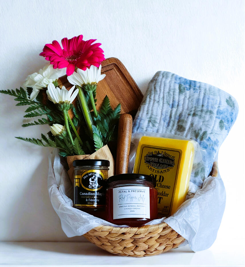 Thoughtfully curated gift baskets featuring small-batch preserves, wildflowers, and handmade touches.