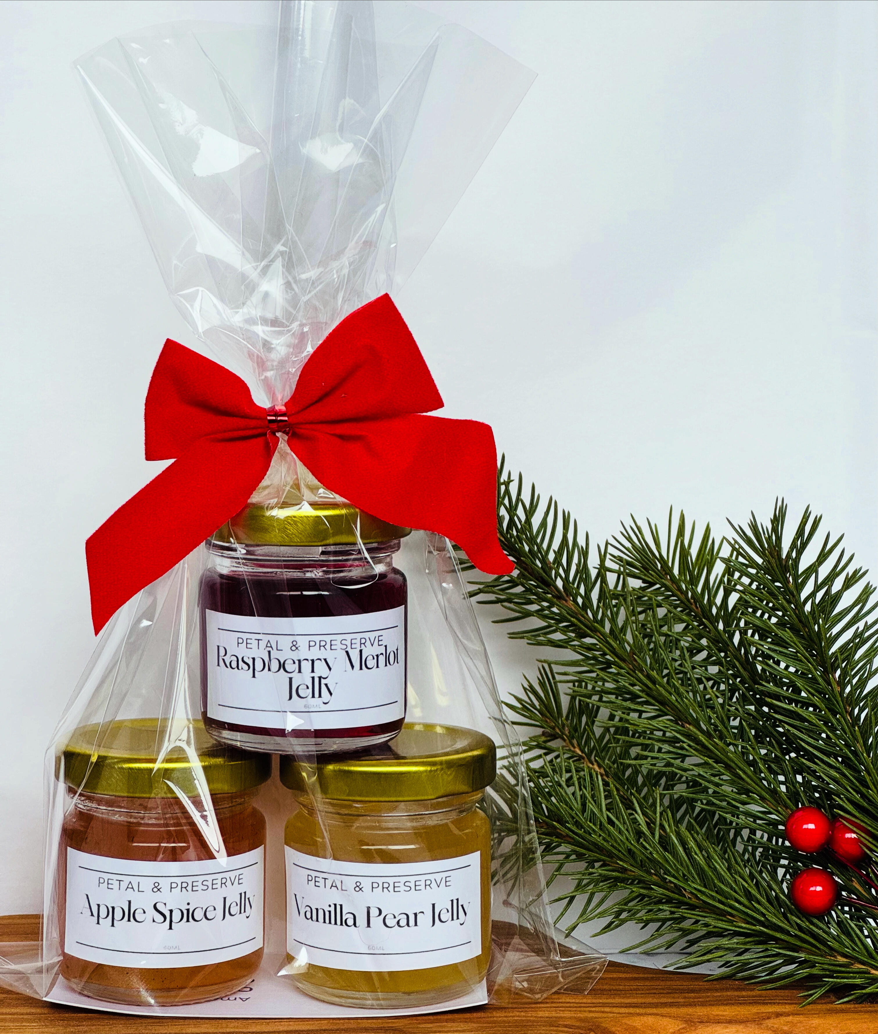 A mini gift set of festive preserves.Spiced Apple: Warm, cozy, and gently spiced with cinnamon and clove.Raspberry Merlot: Rich, vibrant berries infused with a splash of red wine for a deep, elegant flavour.Vanilla Pear: Soft, delicate pear with real vanilla bean. 250ml jars also available.