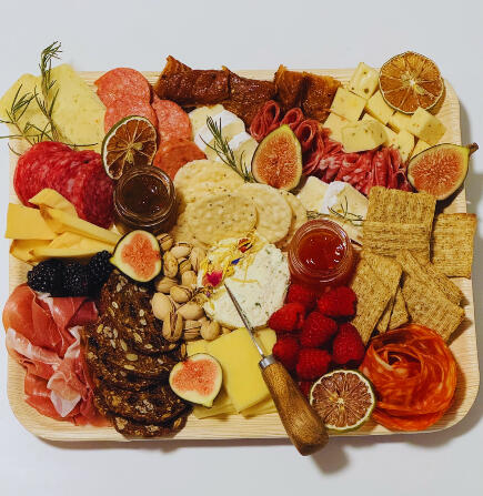 A premium gift featuring high-end pantry items, charcuterie touches,