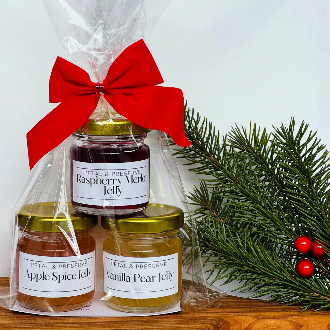 A mini gift set of festive preserves.Spiced Apple: Warm, cozy, and gently spiced with cinnamon and clove.Raspberry Merlot: Rich, vibrant berries infused with a splash of red wine for a deep, elegant flavour.Vanilla Pear: Soft, delicate pear with real vanilla bean. 250ml jars also available.